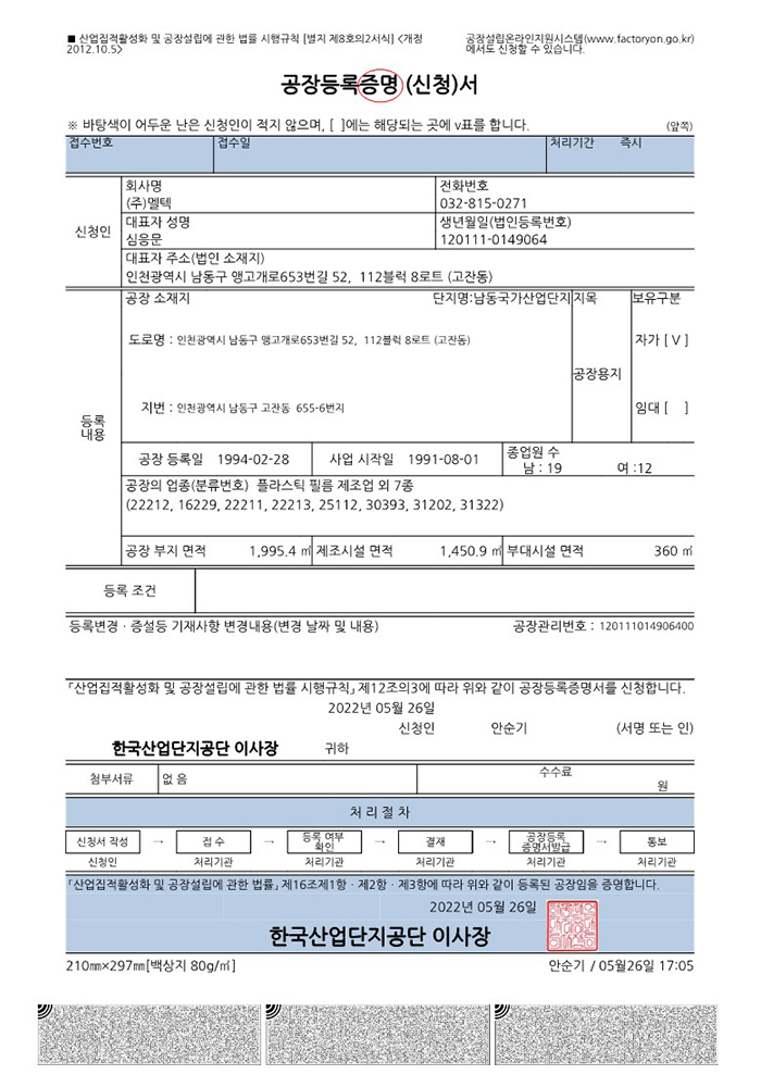 Factory registration certificate for 2nd plant