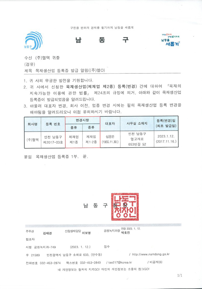 Certificate of registration for the wood production