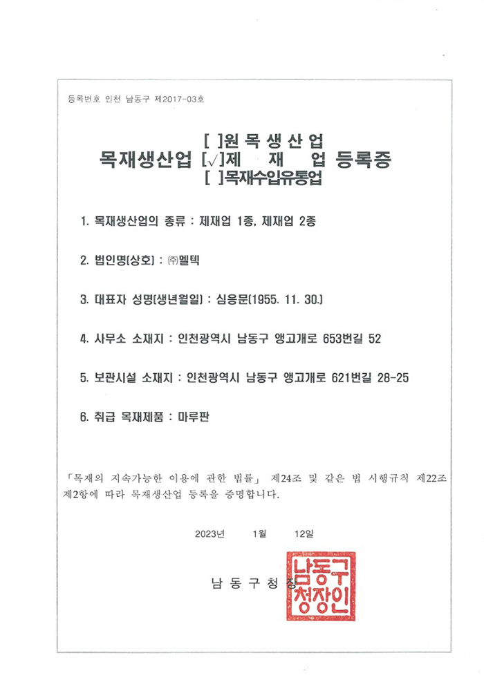 Certificate of registration for the wood production
