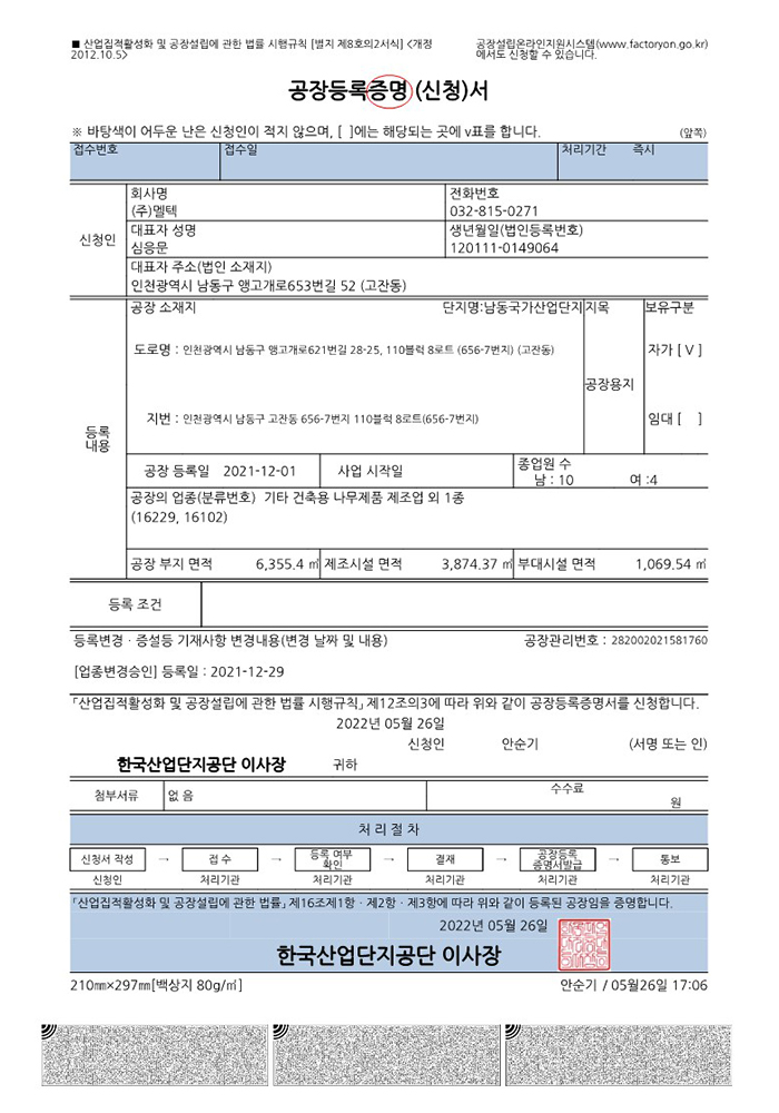 Factory registration certificate for 2nd plant