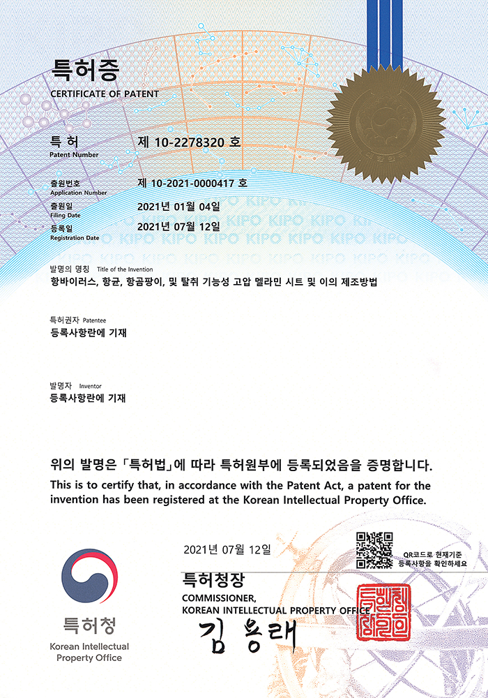 Patent Certificate 페이지 정보 작성자 멜텍 댓글 0건 조회 2회 작성일 26-02-22 16:05 목록 본문 Anti-virus highpressure melamine sheet and its 이전글Confirmation Letter for Venture Business 26.02.22 다음글Notification of Wood Product Standards and Quality Inspection Results 26.02.22
