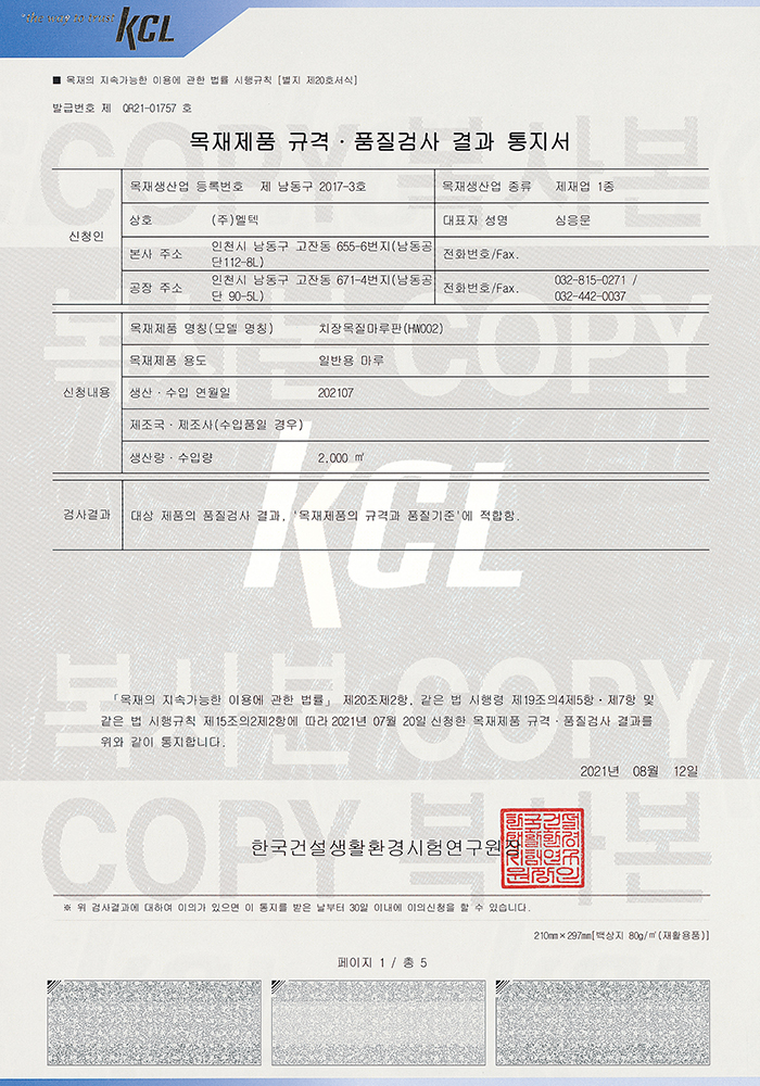 KCL Wood Product Specification and Quality Inspection Result Notificat… 페이지 정보 작성자 멜텍 댓글 0건 조회 2회 작성일 26-02-22 16:07 목록 본문 이전글Business license 26.02.22 다음글Healthy Building Certification 26.02.22